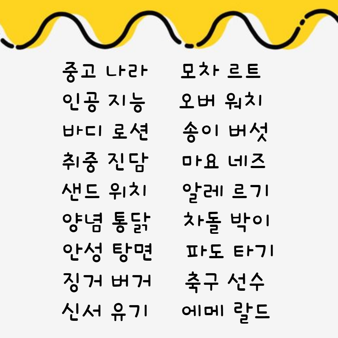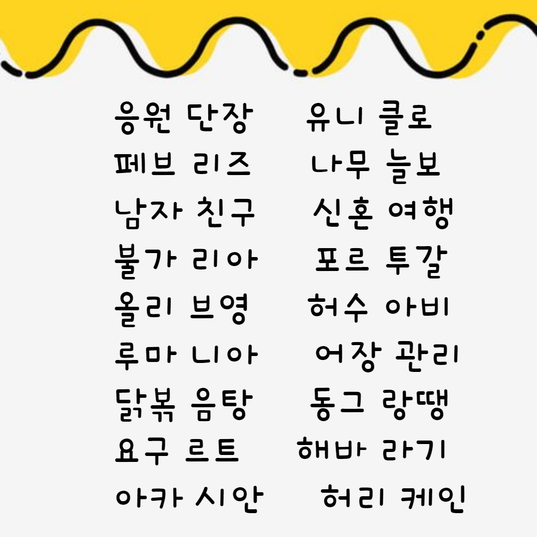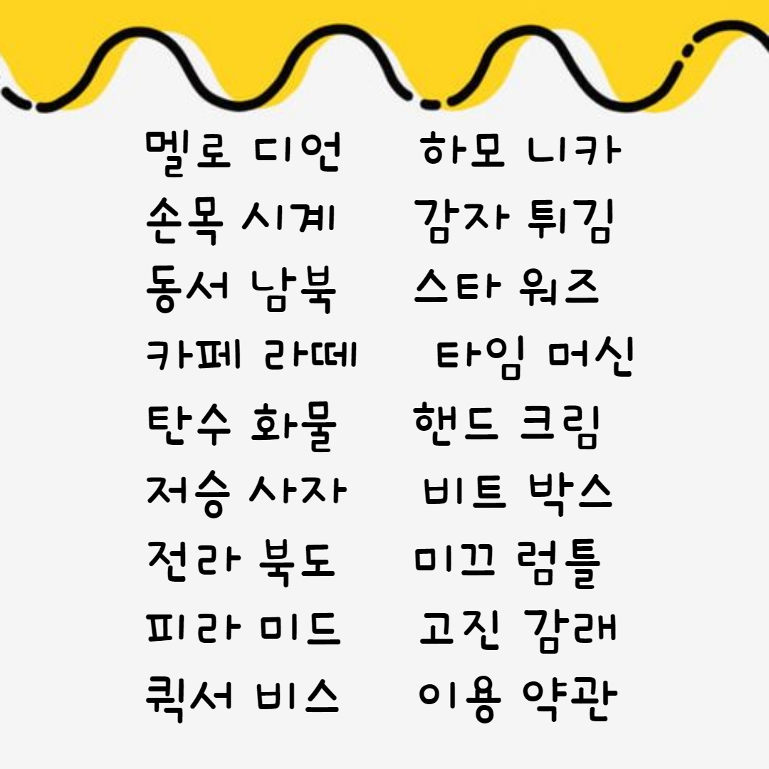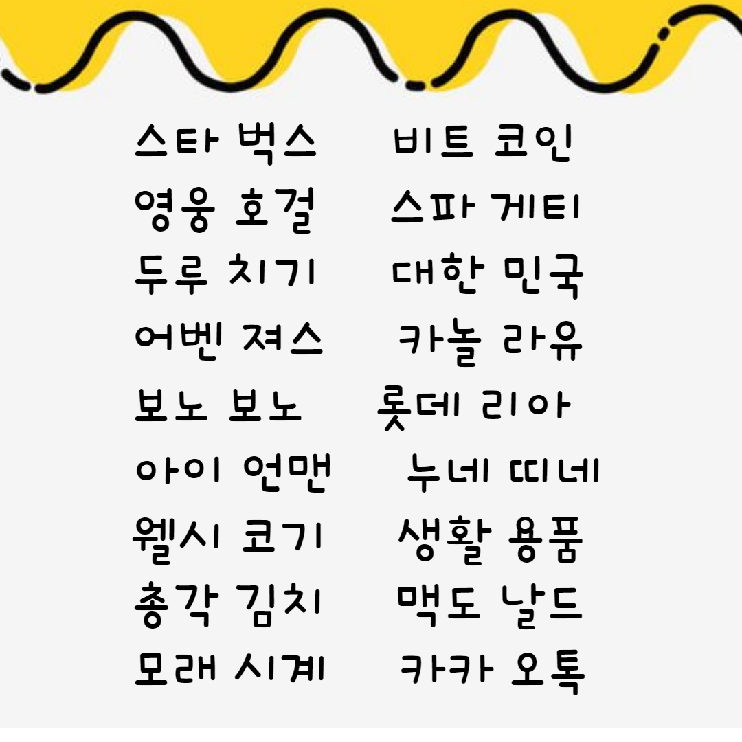 흔하고 잘 사용하는 네 글자 단어 들이지만 막상 게임을 시작하면 바로 생각이 나지 않을 수 있어요.ㅎㅎ